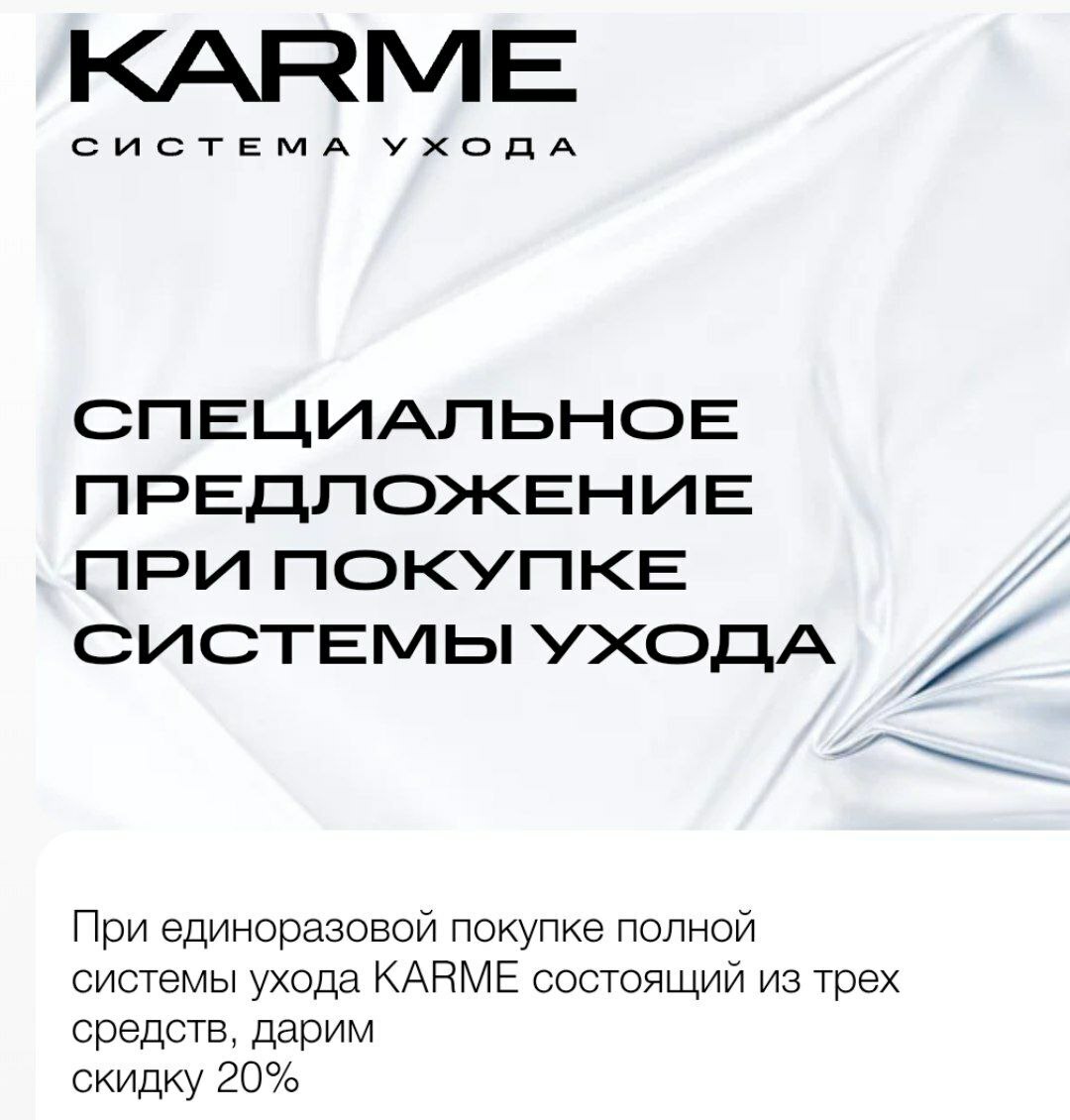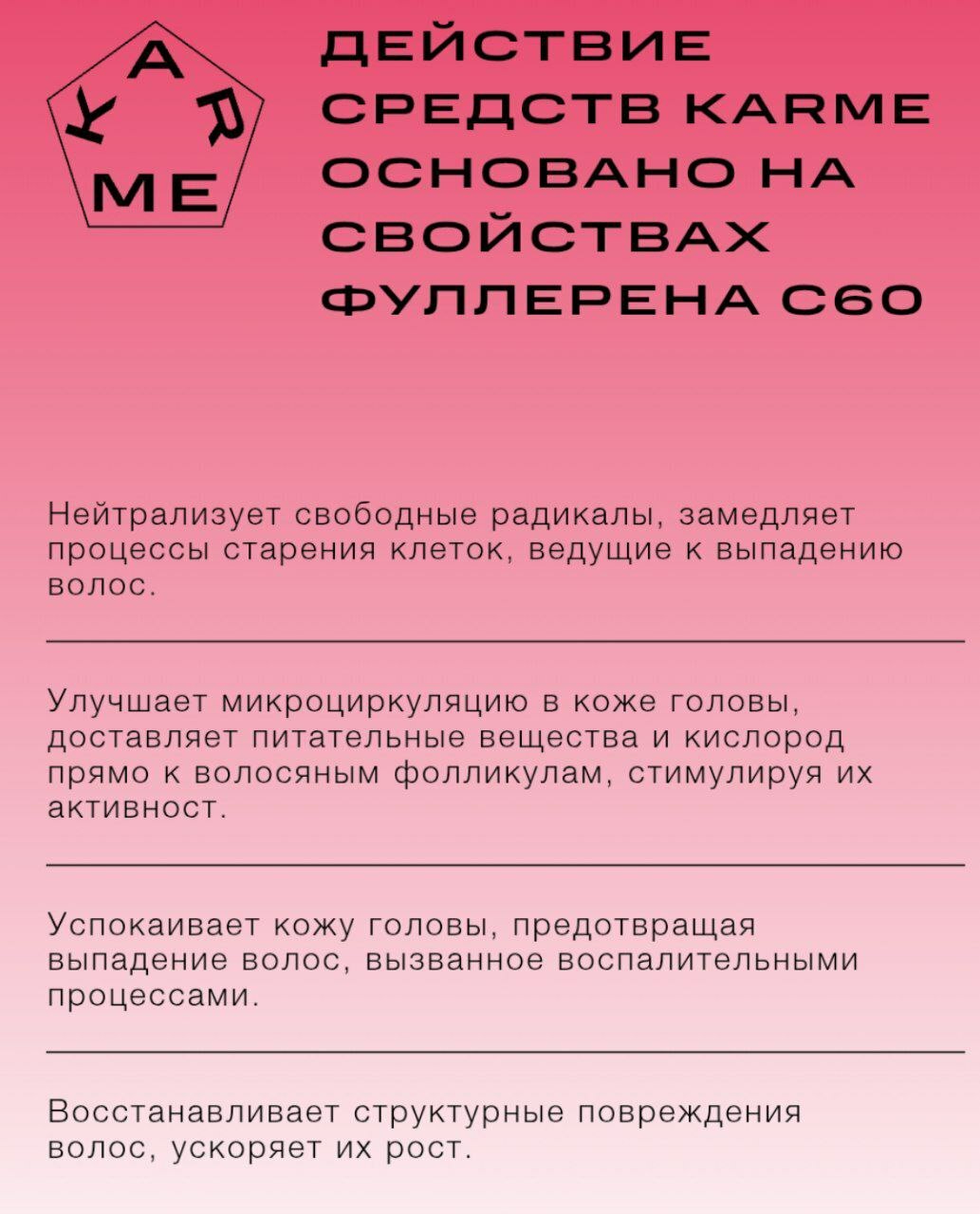 КратСистема ухода KARME – это научно разработанный комплекс средств для волос на основе инновационного действующего вещества фуллерена С60. Средства KARME предназначены для тех, кто решает проблему выпадения, истончения, ослабления, повреждения волос вследствие различных причин от андрогенетической алопеции до последствий стресса и неблагоприятного воздействия окружающей среды.кое описание